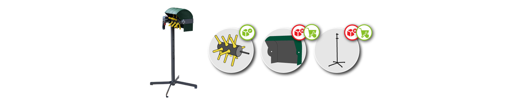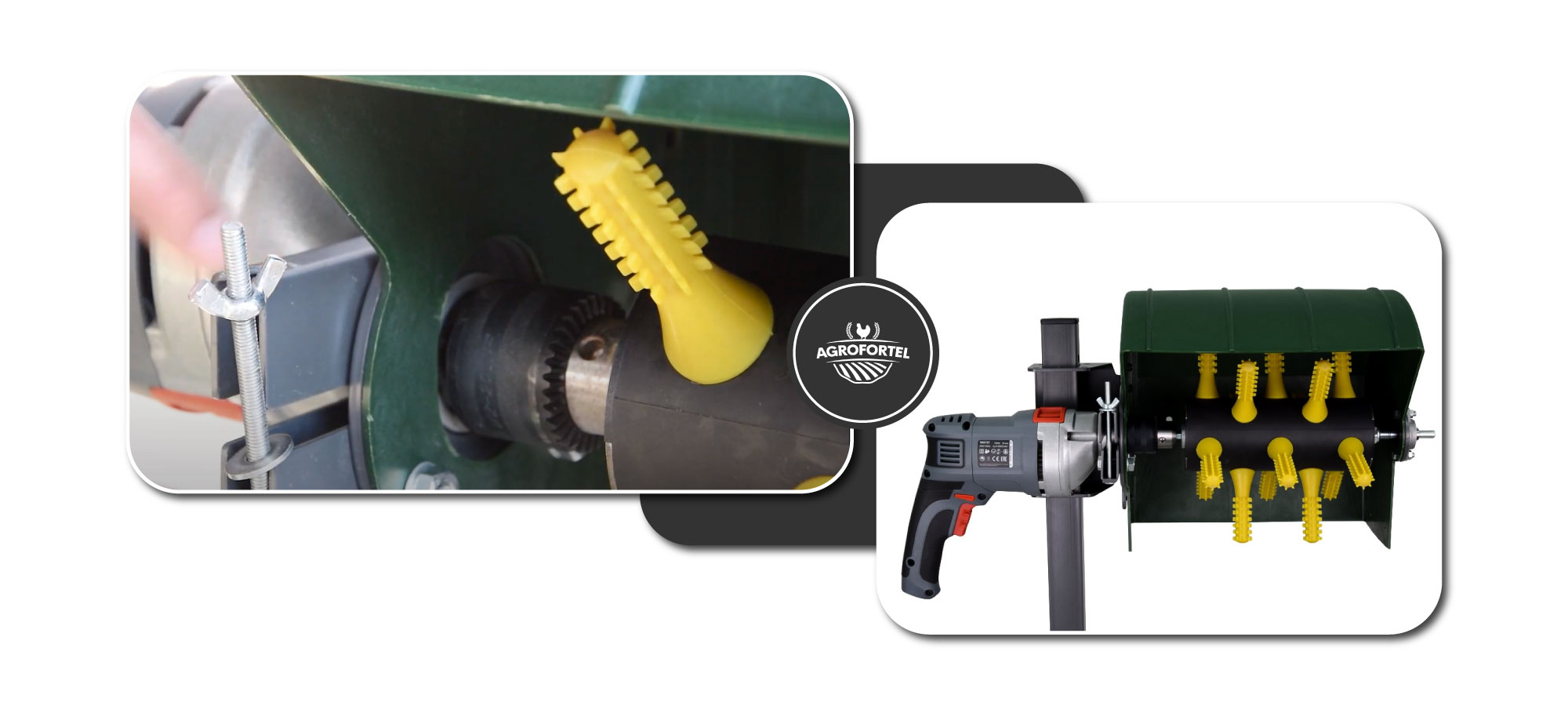Pro správné použití škubačky je třeba ji upevnit do vrtačky (vrtačka – není součástí balení), která bude s výrobkem otáčet. Zařízení, které bude využito k otáčení, doporučujeme upevnit k pracovní ploše (například ke stolu pomocí upínacích objímek či svorek) nebo doporučujeme dokoupit kryt AGROFORTEL 0300c a stojan AGROFORTEL 0300d (příslušenství není součástí balení).