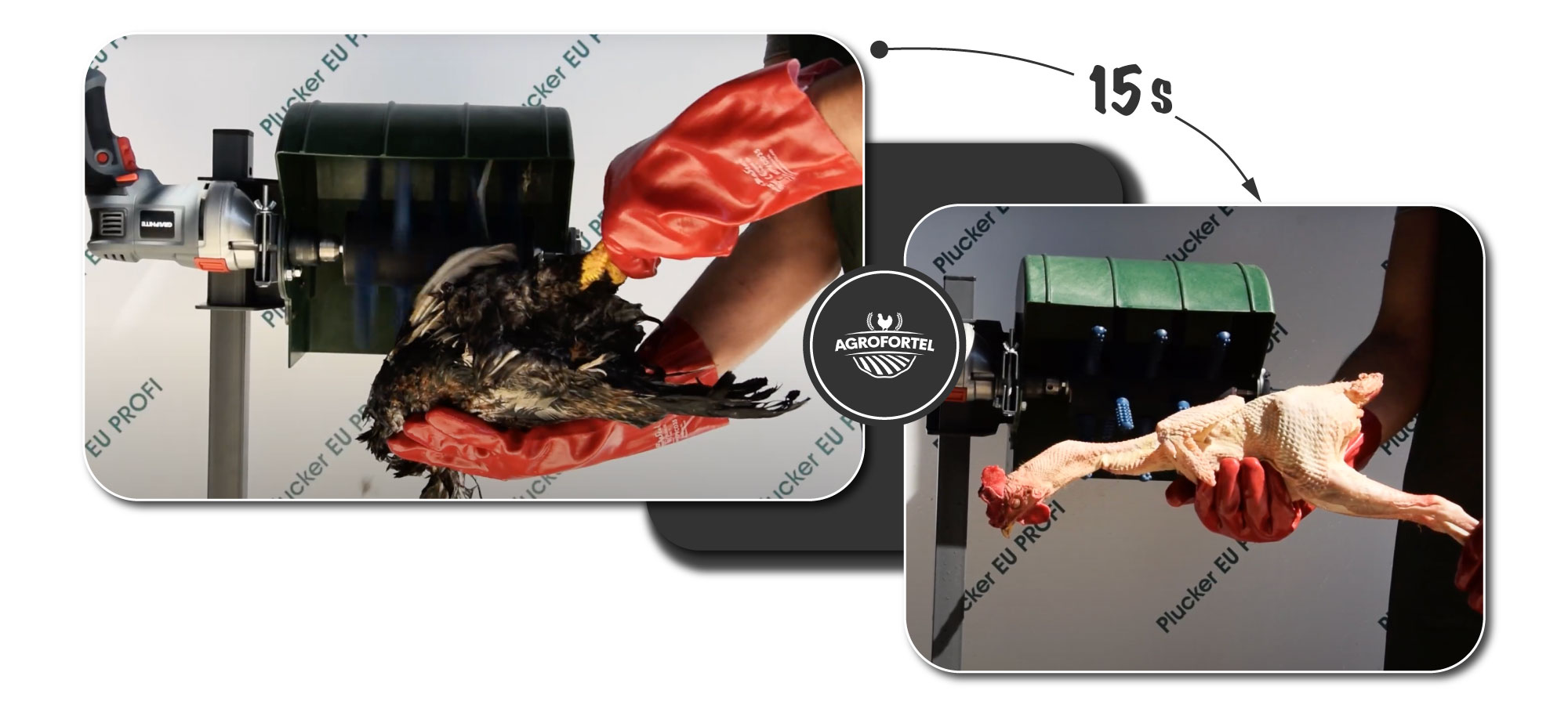 Odkrvenou a spařenou drůbež držte za nohy a otáčejte podél rotujícího válce vždy částí, kterou budete chtít oškubat. Je to velice snadné - se škubačkou na vrtačku AGROFORTEL 0300 C Vám to zabere pouhých 15 sekund!