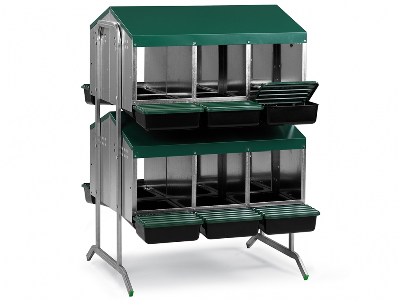 Snáškové hnízdo pro slepice se sběrným košíkem na vejce 12-místné na nožičkách, kapacita až 60 nosnic (5 nosnic na jednu kukaň), dno hnízda je spádované, vejce se samo odkutálí do sběrného košíku, vyrobené z pozinkovaného kovu s plastovým dnem, barva zelená. Hnízdo můžete jednoduše postavit v kurníku na zem,velice snadná údržba čistoty.