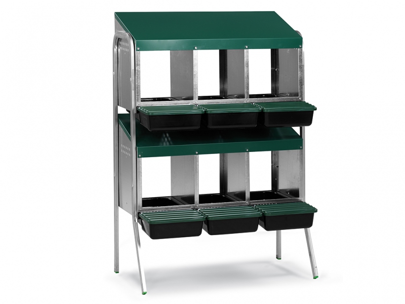 Snáškové hnízdo pro slepice se sběrným košíkem na vejce 6-místné na nožičkách, kapacita až 30 nosnic (5 nosnic na jednu kukaň), dno hnízda je spádované, vejce se samo odkutálí do sběrného košíku, vyrobené z pozinkovaného kovu s plastovým dnem, barva zelená. Hnízdo můžete jednoduše postavit v kurníku na zem,velice snadná údržba čistoty.