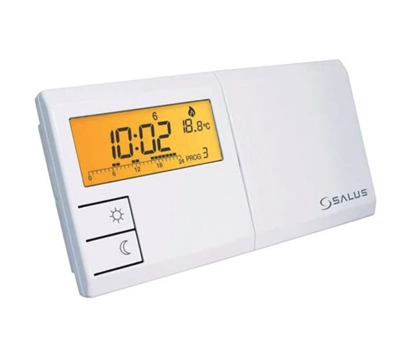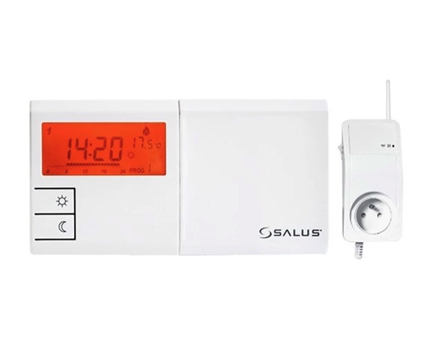 Týdenní programovatelný termostat, pomocí kterého lze jednoduše a efektivně nastavit kontrolu teploty v místnosti. Vzhledem ke svému širokému využití je univerzální programovatelný termostat s beznapěťovým kontaktem, vhodný k regulaci všech typů kotlů, elektrických přímotopů, spíná zařízení od 0-230 V s maximální zátěží 5A. Jedná se inovovaný model bezdrátového termostatu SALUS 091TX+s možností nastavit citlivost teploty již od 0,2°C . Nově podsvícený displej. Naprosto totožné programování jako u předchozího typu termostatu. Nový facelift s lesklým designem