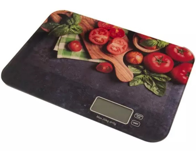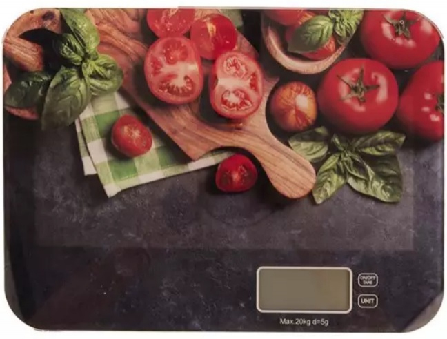 Váha kuchyňská digitální s LCD displejem, s možností vážení v g, kg, lb, oz, ml, fl.oz. Váživost 20 kg, minimální měrná hodnota 5g, automatické vypnutí, možnost vynulování TARE.