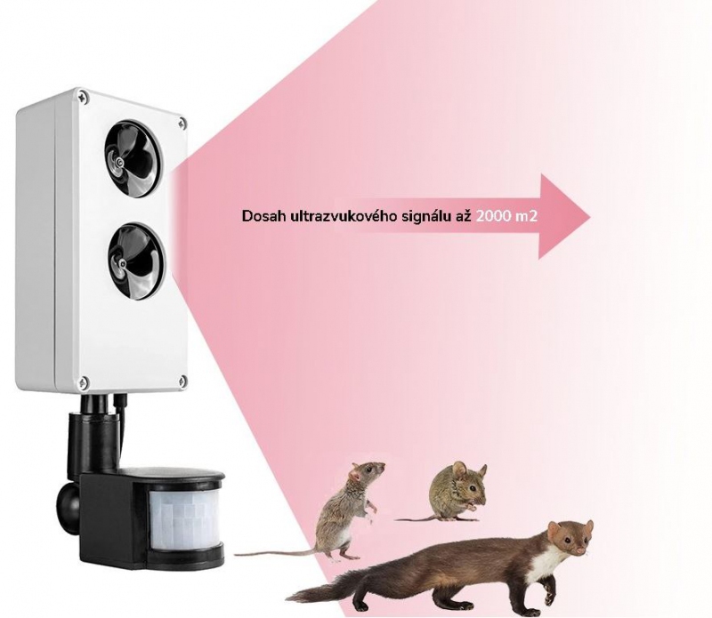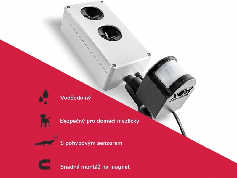 Ultrazvukový odpuzovač zvěře vhodný k plašení kun a hlodavců, bezpečný pro člověka i domácí zvířata. K použití ve vnitřních i venkovních prostorech, vybavený odolným vodotěsným krytem s možností uchycení přes magnetický držák. Odpuzovač kun s rozsahem tónu v úhlu 180° s automatickou změnou kmitočtu a dosahem až 2000 m2, s napájením přímo ze sítě na 230 V. Plašič kun používá 2 x 50 mm membránové reproduktory a nastavitelný pohybový senzor, rozměry ultrazvukového odpuzovače 70 x150 x 55 mm.