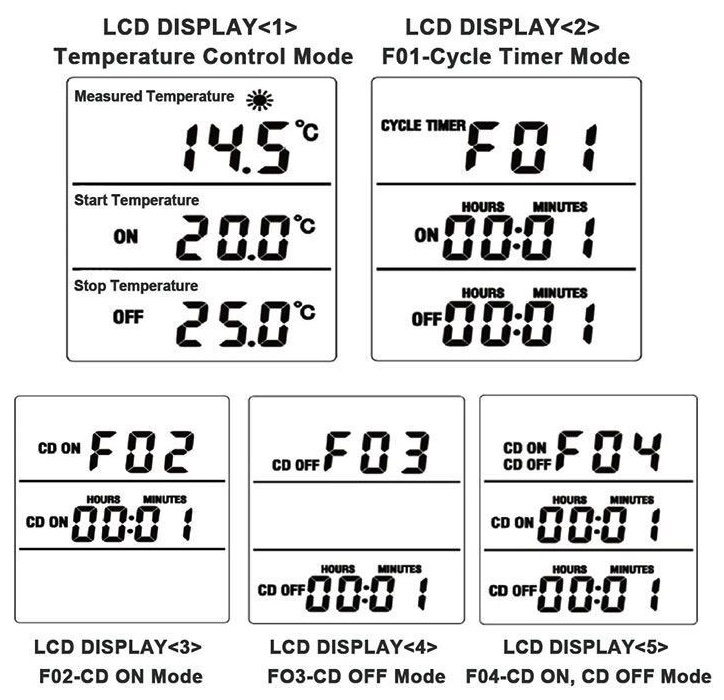 Tlačítky SET a následně DOWN a UP lze nastavit teplotu pro zapnutí a vypnutí, přičemž pod –10°C a nad 100°C lze nastavit s rozlišením 1°C - 2: F01 Režim cyklického zapínání a vypínání: