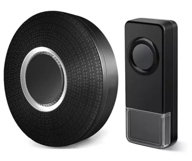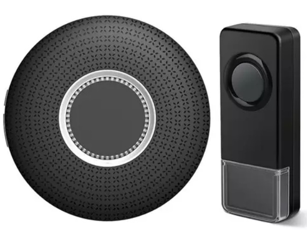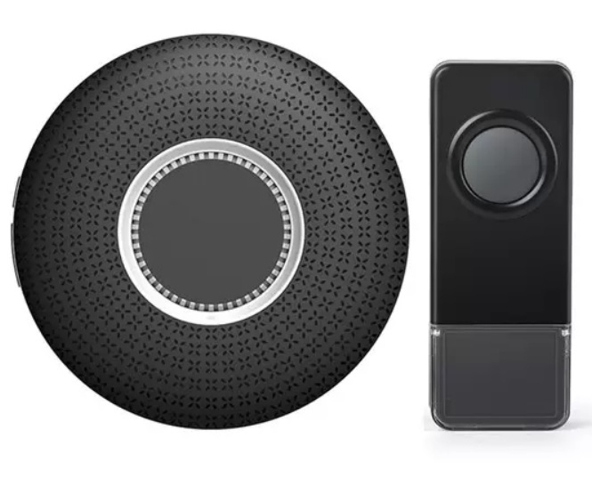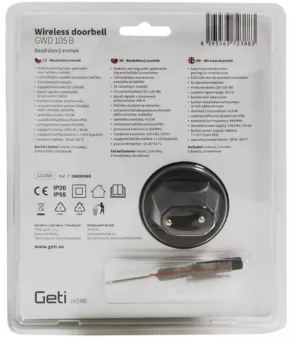 Součást balení: zvonek, tlačítko, návod, 2 šroubky, 2 hmoždínky, šroubovák