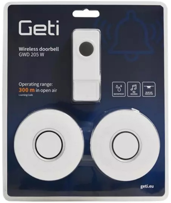 Sada 2 zvonků a 1 tlačítka GETI GWD 205 W se hodí nejen k domu či bytu, ale také do kanceláří, továren či recepčních hal. Velkou předností těchto zvonků je jejich bezdrátové provedení s dosahem až 300 m ve volném prostoru. Instalace zvonků je velmi snadná, spárování mezi vysílačem a zvonkem probíhá automaticky. Funkce LEARNING CODE navíc umožnuje vzájemné spárování více tlačítek a zvonků. Nemusíte se obávat ani deštivého počasí, tlačítko vysílače s LED indikací je voděodolné. Zvonky mají jednoduchý moderní design, 4 stupně hlasitosti, výběr z 52 vyzváněcích melodií a světelnou signalizaci zvonění. Velkou výhodou zvonků je zapamatování si nastavené melodie a hlasitosti i po odpojení přístrojů od elektrické sítě.