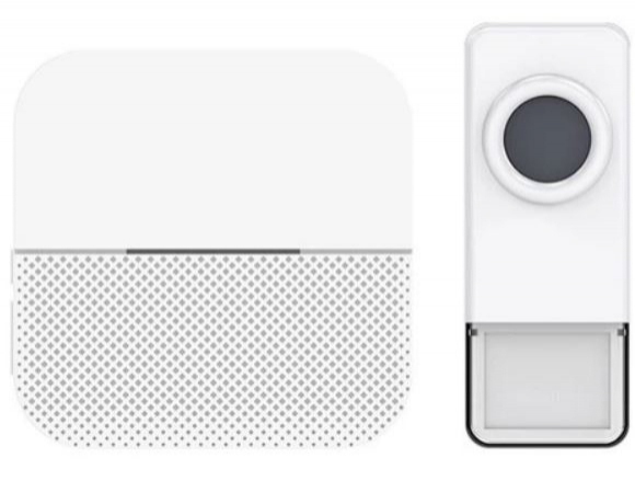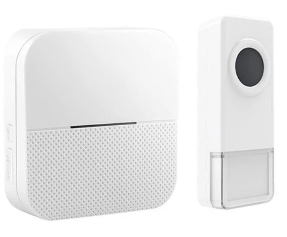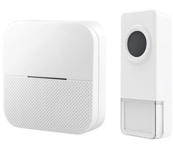 Součást balení: zvonek, tlačítko, návod, 2 šroubky, 2 hmoždínky, šroubovák