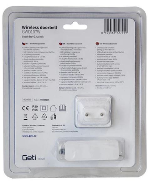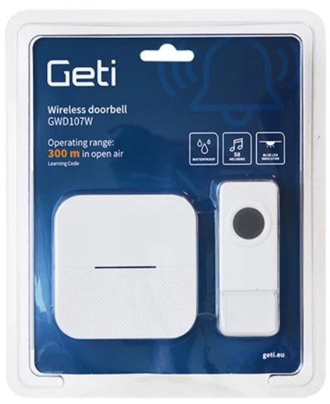 Spolehlivý zvonek GETI GWD107W se hodí nejen k domu či bytu, ale také do kanceláří, továren či recepčních hal. Velkou předností tohoto zvonku je jeho bezdrátové provedení s dosahem až 300 m ve volném prostoru. Instalace zvonku je velmi snadná, spárování mezi vysílačem a zvonkem probíhá automaticky. Funkce LEARNING CODE navíc umožnuje vzájemné spárování více tlačítek a zvonků. Nemusíte se obávat ani deštivého počasí, tlačítko vysílače s LED indikací je voděodolné. Zvonek má jednoduchý moderní design, 4 stupně hlasitosti, výběr z 52 vyzváněcích melodií a světelnou signalizace zvonění. Velkou výhodou zvonku je zapamatování si nastavené melodie a hlasitosti i po odpojení přístroje od elektrické sítě.