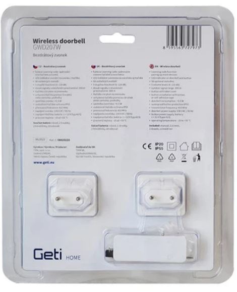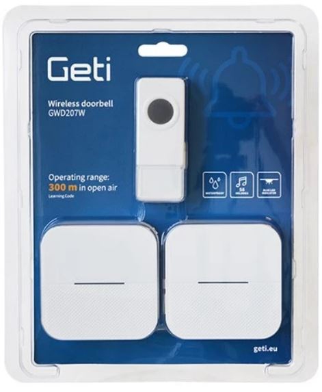 Sada 2 zvonků a 1 tlačítka GETI GWD207W se hodí nejen k domu či bytu, ale také do kanceláří, továren či recepčních hal. Velkou předností těchto zvonků je jejich bezdrátové provedení s dosahem až 300 m ve volném prostoru. Instalace zvonků je velmi snadná, spárování mezi vysílačem a zvonkem probíhá automaticky. Funkce LEARNING CODE navíc umožnuje vzájemné spárování více tlačítek a zvonků. Nemusíte se obávat ani deštivého počasí, tlačítko vysílače s LED indikací je voděodolné. Zvonky mají jednoduchý moderní design, 4 stupně hlasitosti, výběr z 52 vyzváněcích melodií a světelnou signalizaci zvonění. Velkou výhodou zvonků je zapamatování si nastavené melodie a hlasitosti i po odpojení přístrojů od elektrické sítě.